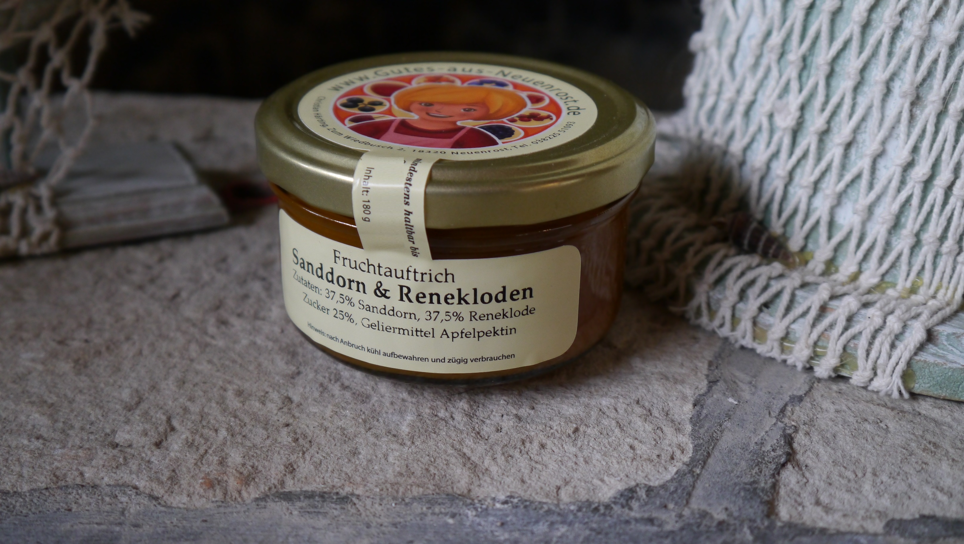 Reneklode ähnelt einer Mirabelle und ist eine süße, grüne Pflaume . Der Sanddorn kommt aus der Region (nähe Marlow). Es ist ein eher süßerer Sanddornaufstrich.