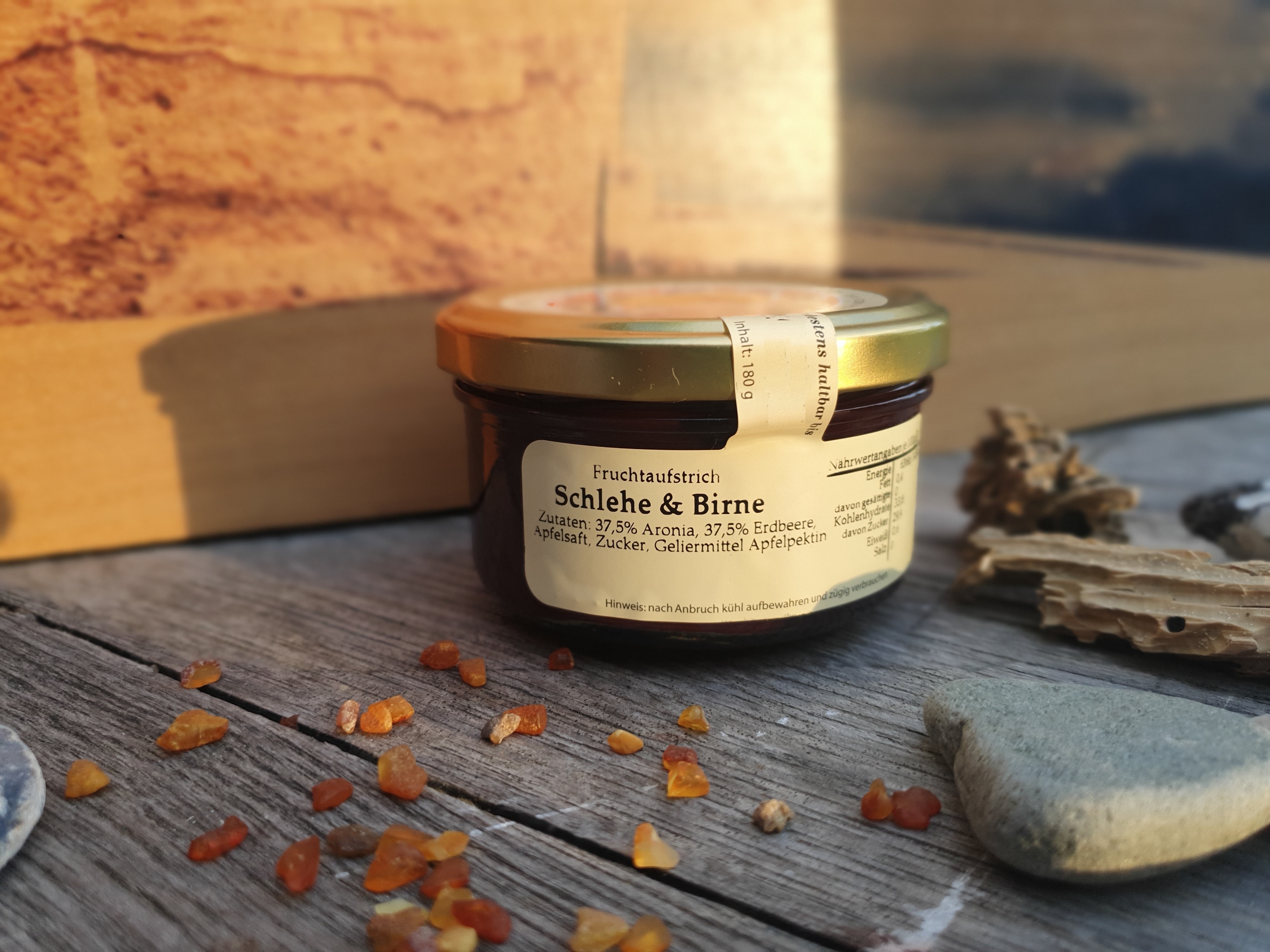 Schlehen sind als sehr stumpf und bitter solange sie keinen Frost bekommen. Durch das Einfrieren unsererseits, verlieren Schlehen einen Großteil ihrer eher negativen geschmacklichen Eigenschaften. Sie bleiben im Fruchtaufstrich aber noch erkennbar. Unsere eigenen Birnen runden den Geschmack ab und bilden mit der Birne einen süßen, leicht bitteren Geschmack. Sie ist gut geeignet mit Frischkäse.